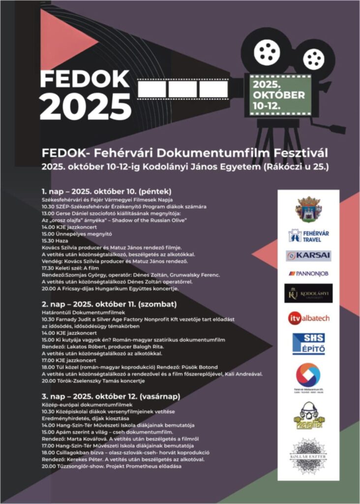 A FEDOK – Fehérvári Dokumentumfilm Fesztivál három napon át kínál felejthetetlen élményeket: díjnyertes alkotások, különleges premierfilmek, izgalmas közönségtalálkozók, inspiráló előadások, élő jazzkoncertek és művészeti kiállítások várják az érdeklődőket a Kodolányi János Egyetemen.
