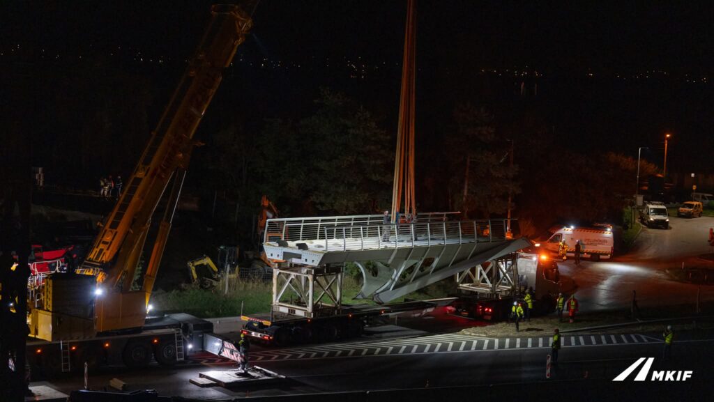 A most beemelt szerkezeti részek hatalmasak: a 193 tonnás, 80 méter hosszú híd összesen nyolc elemből áll, amelyeket kettesével illesztettek össze. Most ezekből négy került a helyére, a többi elem októberben következik.