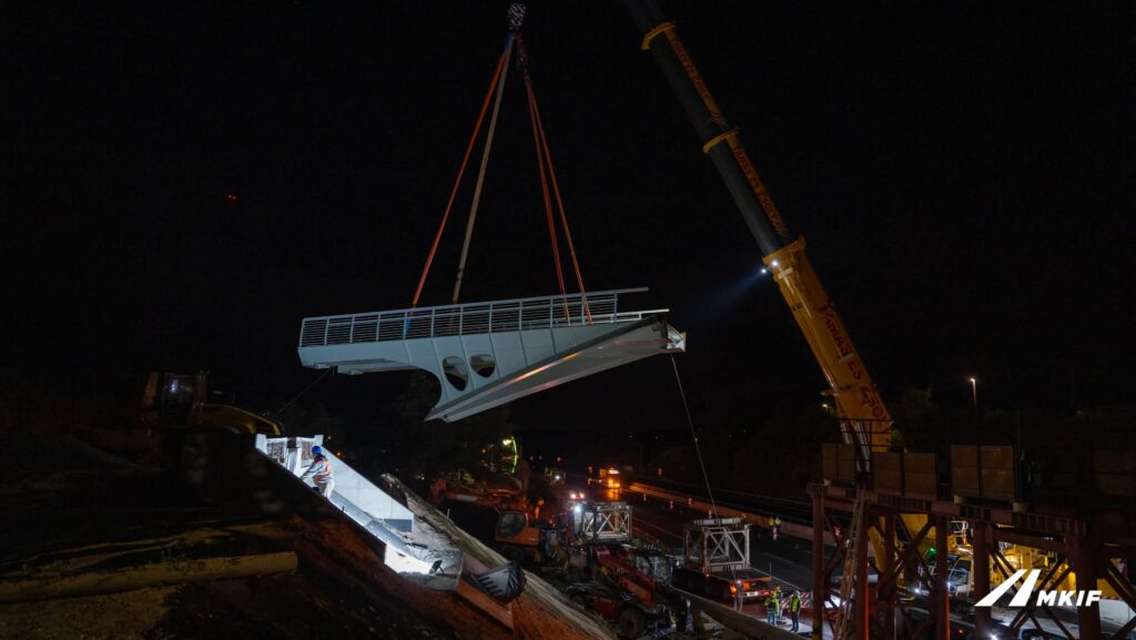 Velencénél hétvégén fontos mérföldkőhöz érkezett az M7-es autópálya: szombatról vasárnapra virradóra beemelték az új gyalogos- és kerékpáros híd első elemeit a főváros felé vezető pálya fölé.